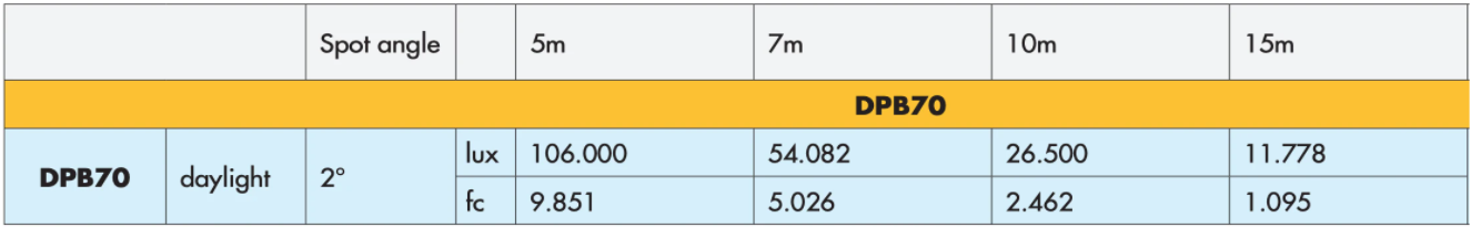Le DPB70 est une lumière spéciale qui produit un faisceau parallèle de 2° d'un diamètre de 70 cm (2.3'). La lumière est très efficace et homogène au-delà de 10°.